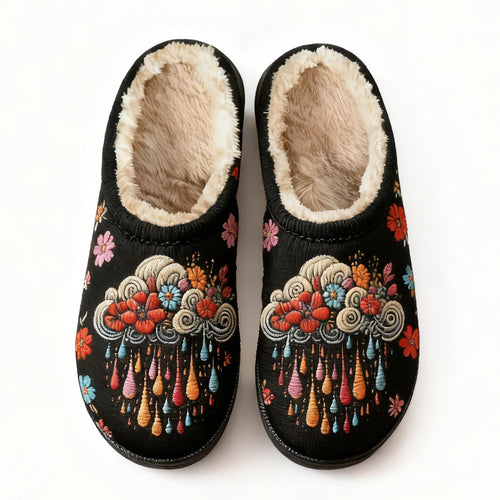 Black Floral Cloud Raindrop Embroidery Plush Printed Slippers -